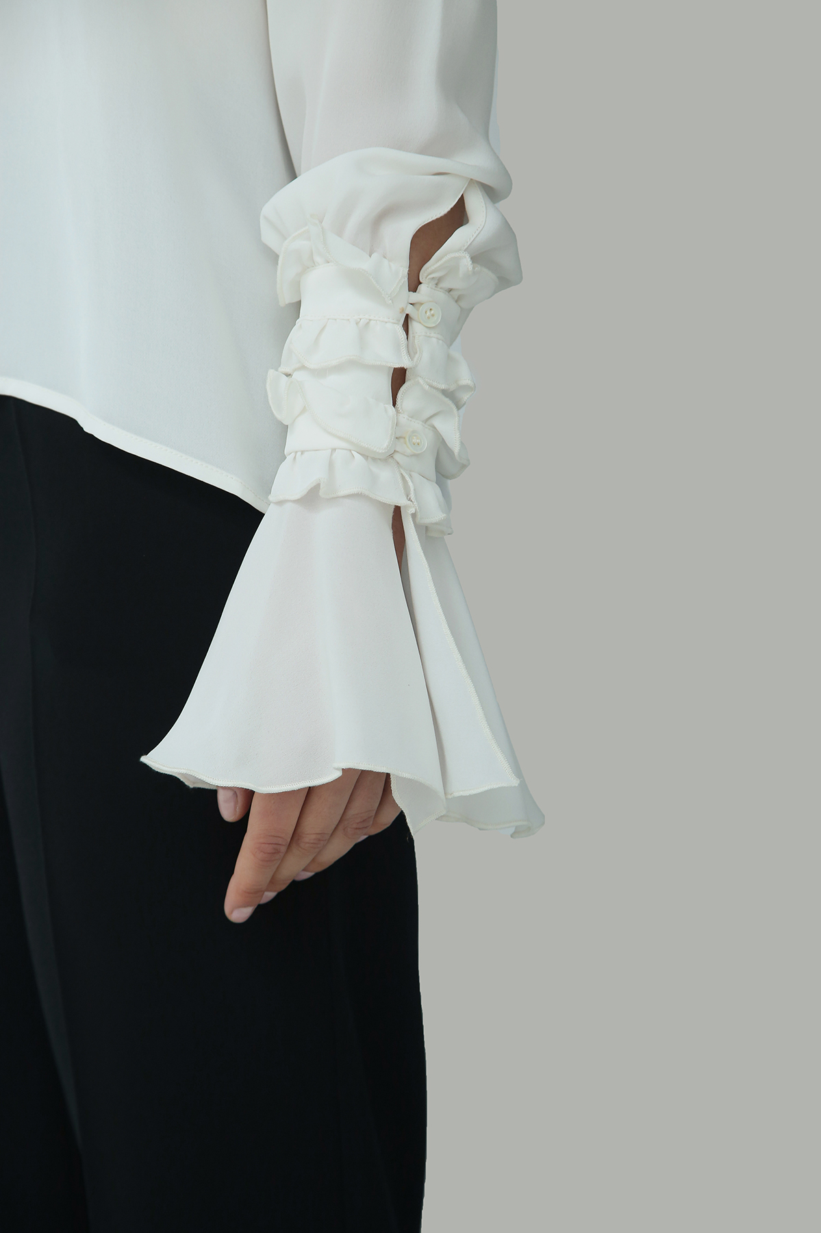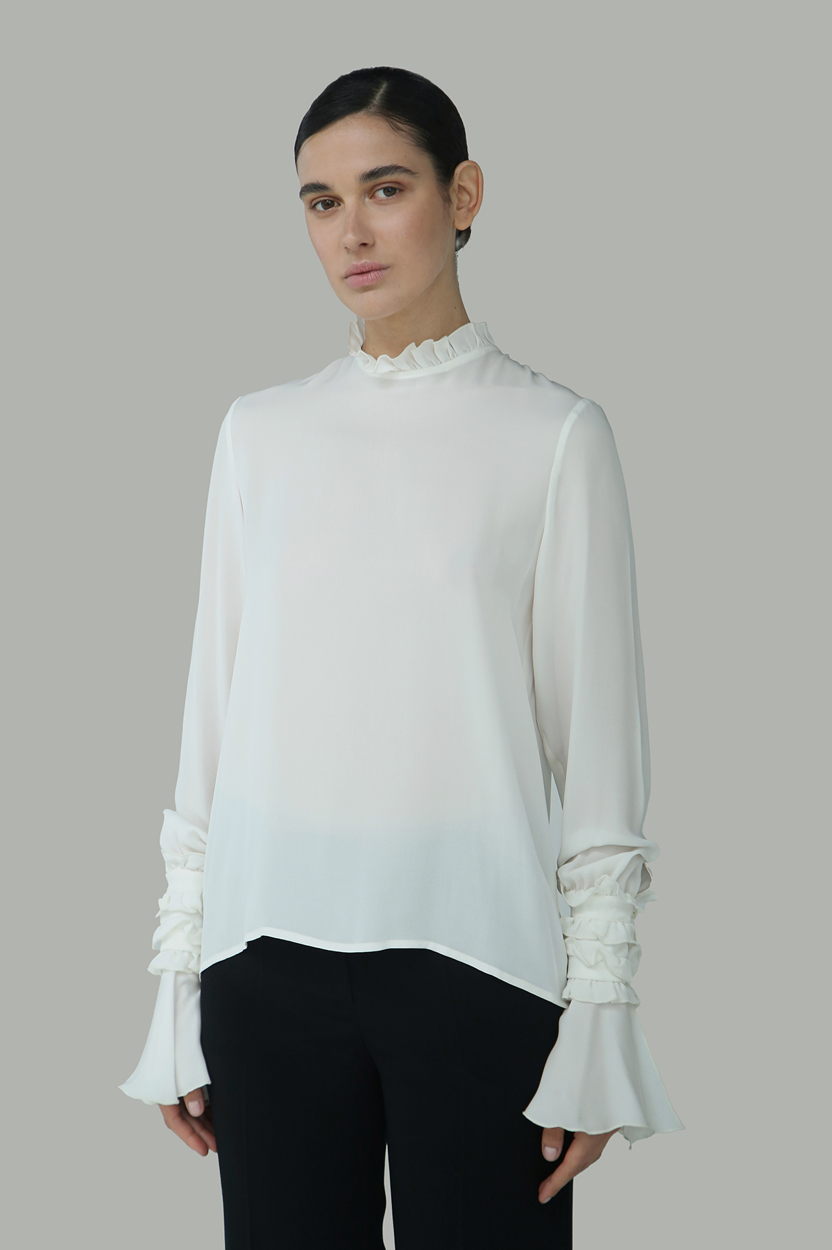 Blusa realizzata in crepe de chine di seta color bianco latte, caratterizzata da collo gorgiera e polsini volant, di chiara ispirazione storica, il colletto dona un’allure regale in chiave moderna.
