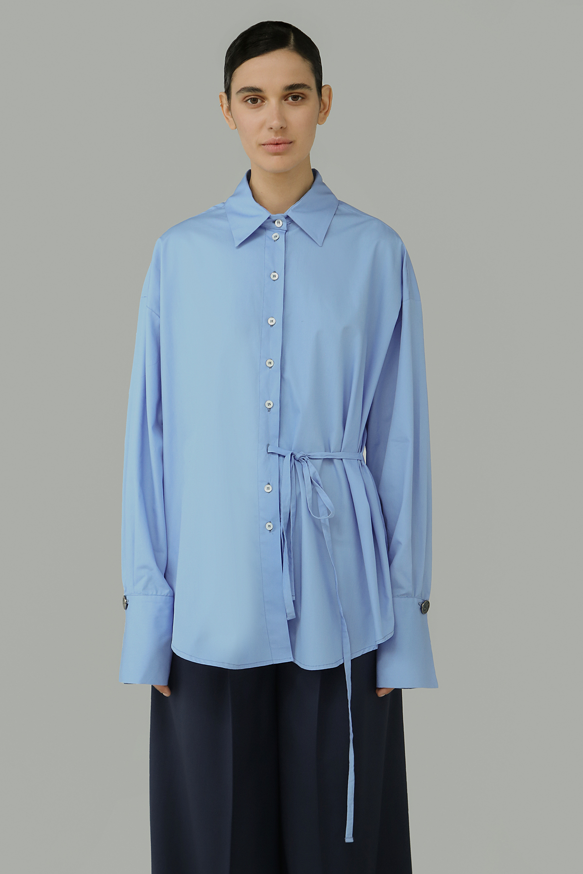 DescrizioneCamicia in popeline di cotone, dal taglio over, con vestibilità morbida impreziosita da polsini con bottoni dal design contemporaneo. Internamente, l'opzione dei lacci permette di personalizzare lo styling, offrendo versatilità e originalità a chi indossa questo capo unico.