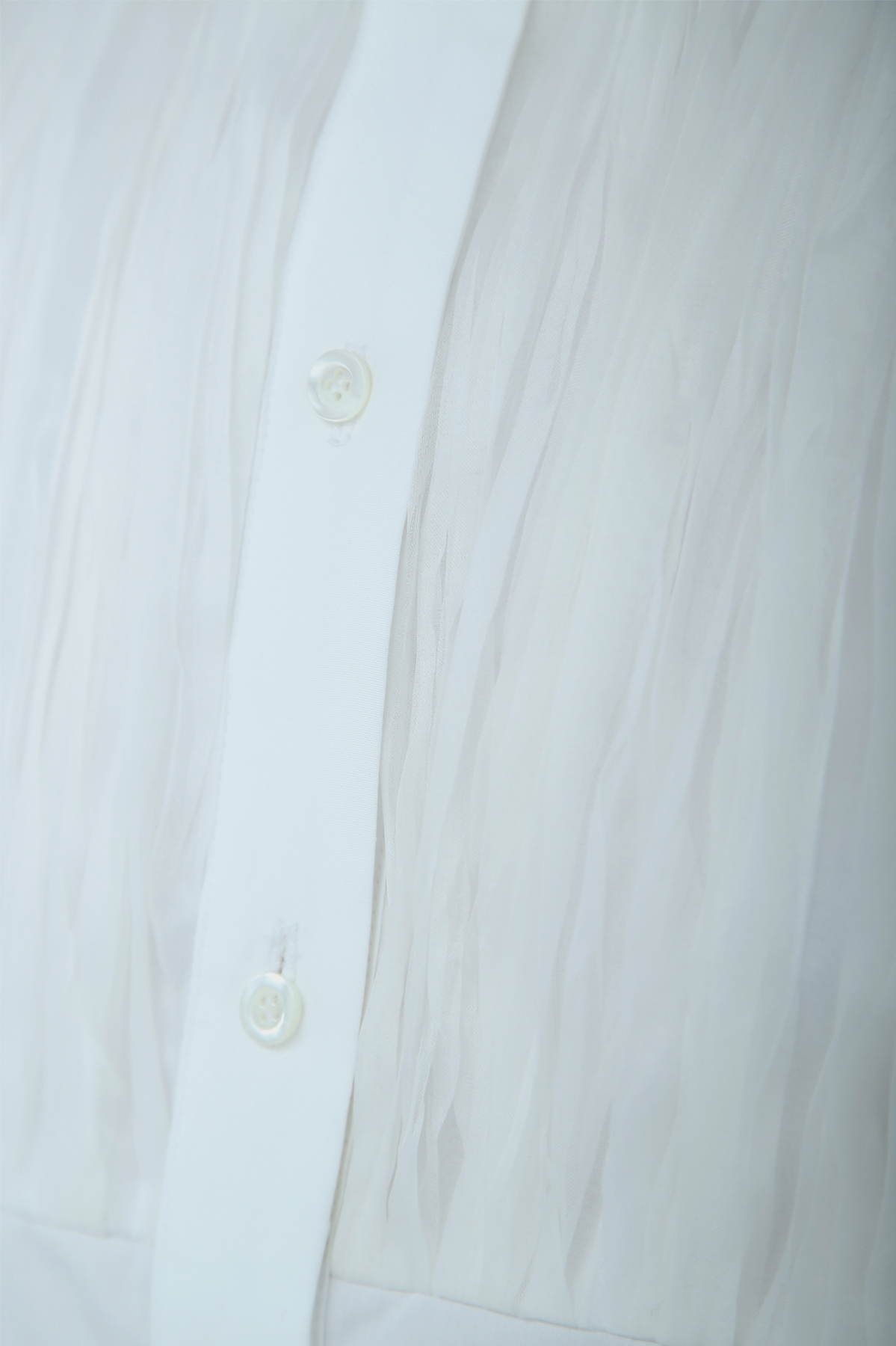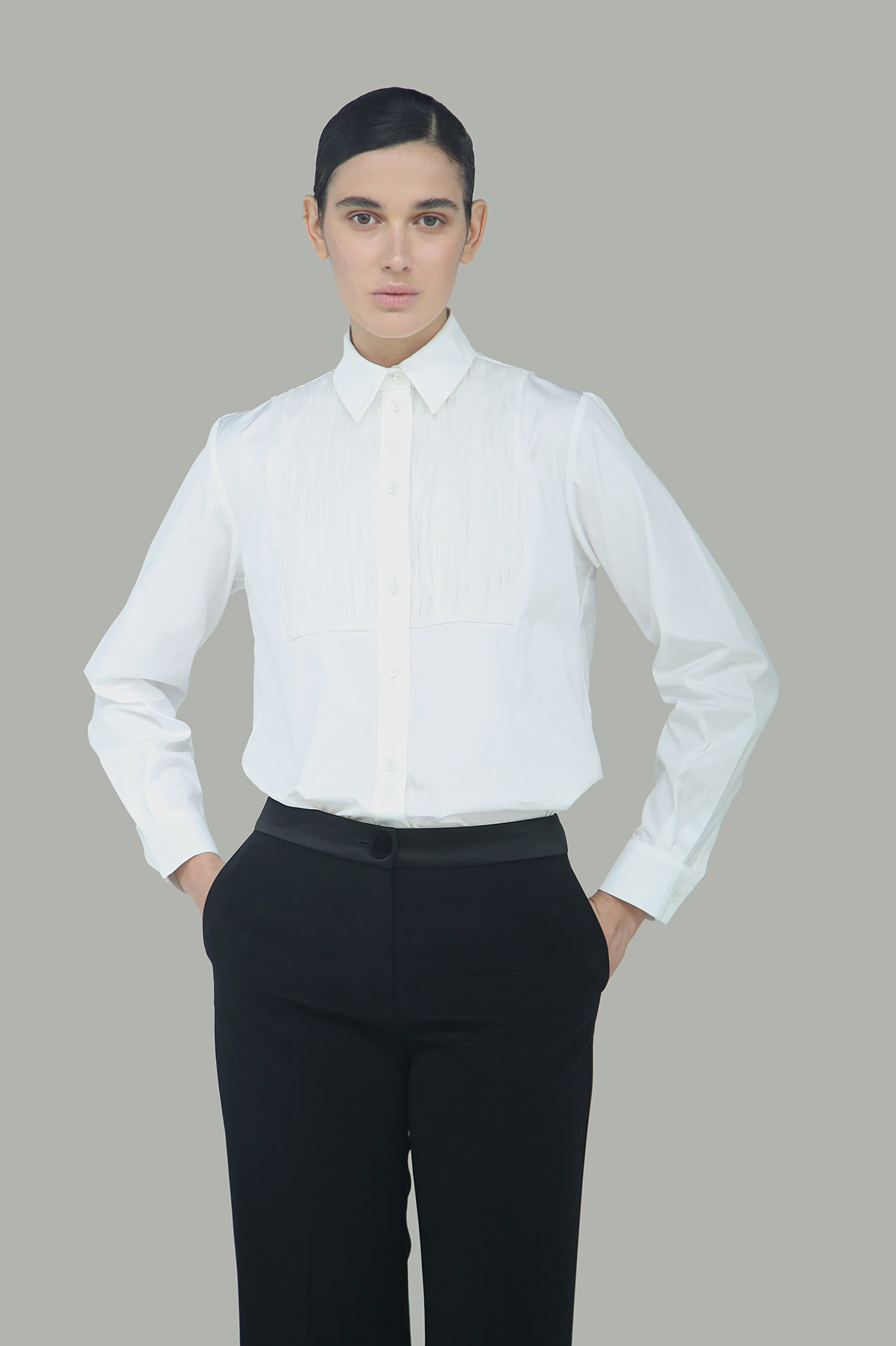 DescrizioneCamicia smoking realizzata in popeline di cotone bianco con pettorina arricchita da inserto in organza plissettata. La linea è regular fit e l’abbottonatura è a vista con bottoncini in madre perla.