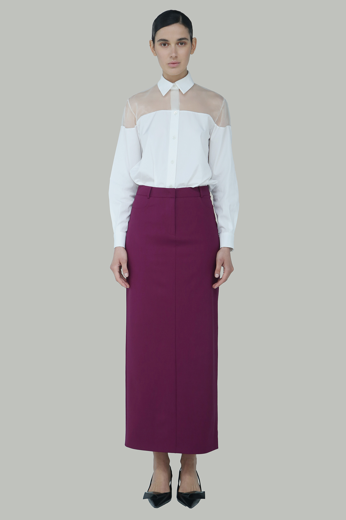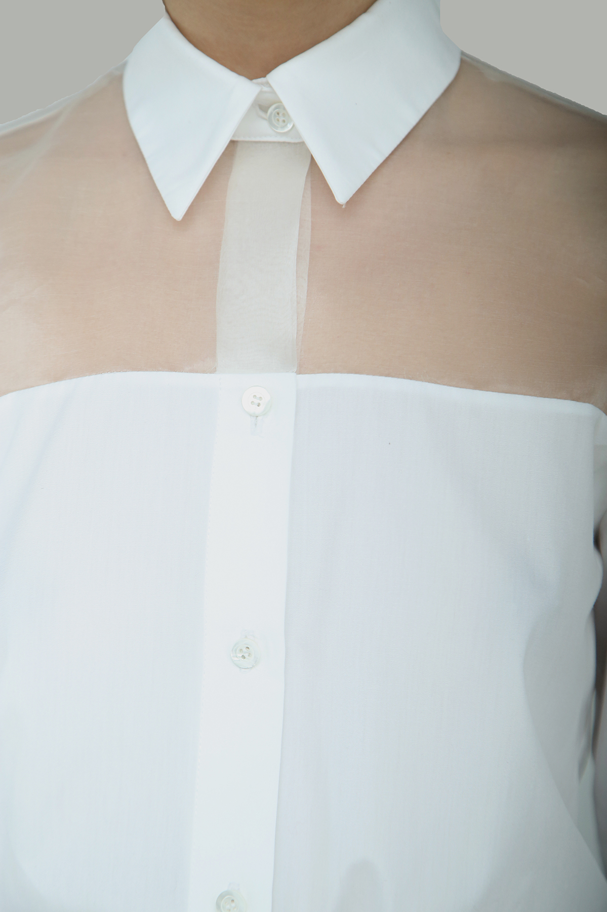DescrizioneCamicia in popeline di cotone bianco, dal taglio uomo, dritta con vestibilità morbida impreziosita da inserti in organza di seta che donano uno stile grintoso grazie al gioco di trasparenze e alle linee geometriche esaltate dai tagli stilistici del modello.