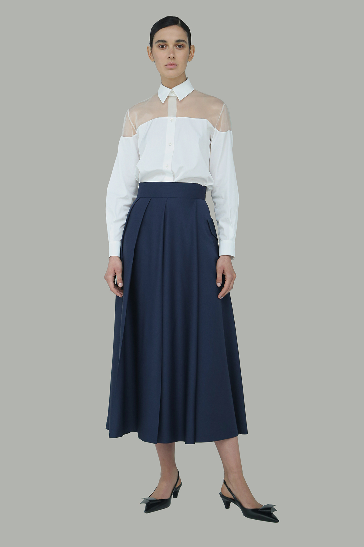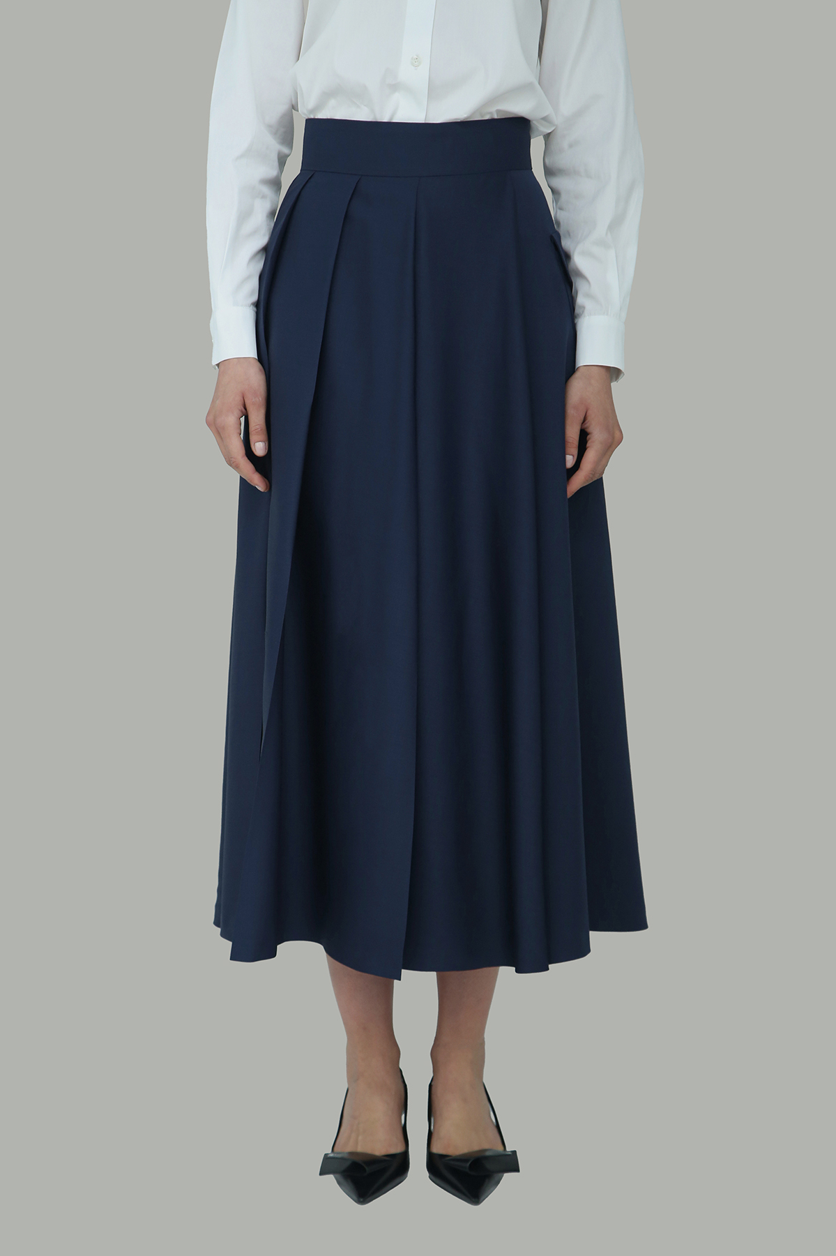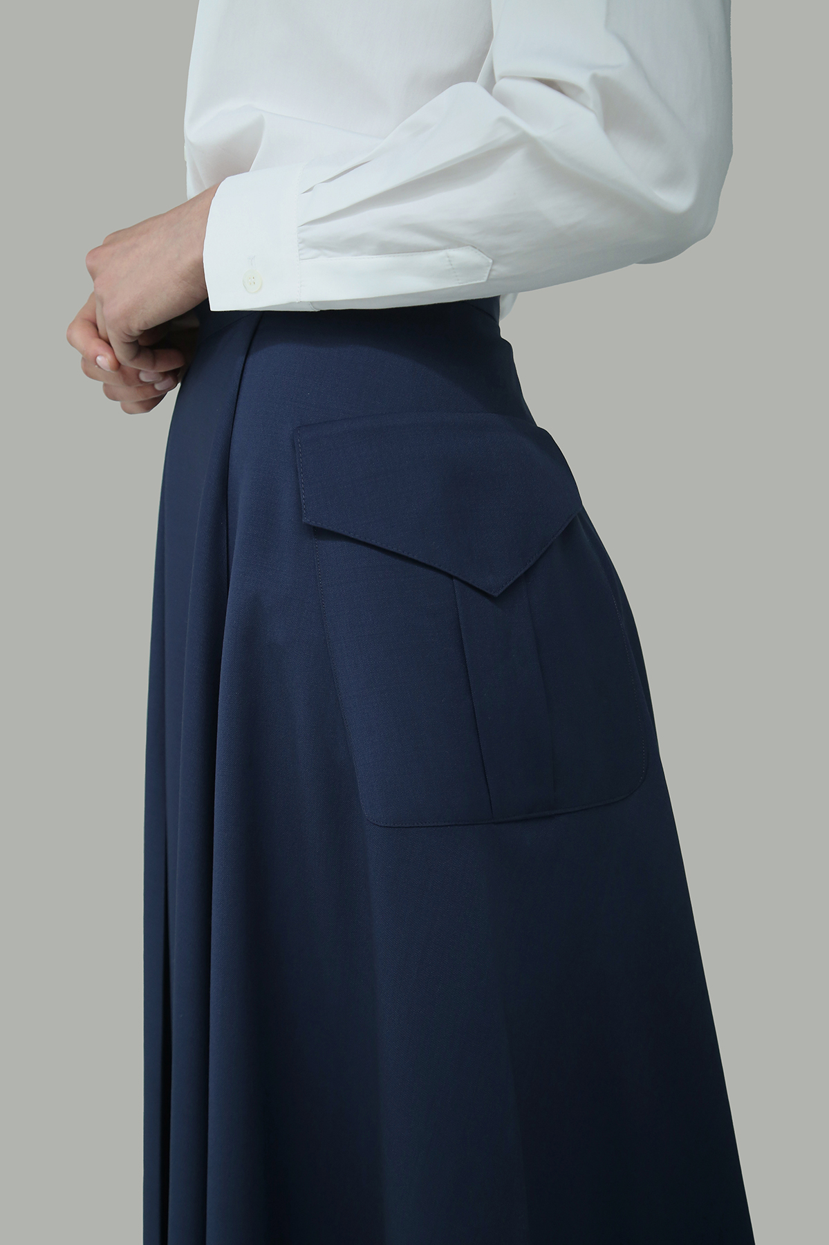 DescrizioneGonna con pannello a pieghe, realizzata in fresco di lana con tasca cargo laterale e chiusura lampo invisibile sul centro dietro.