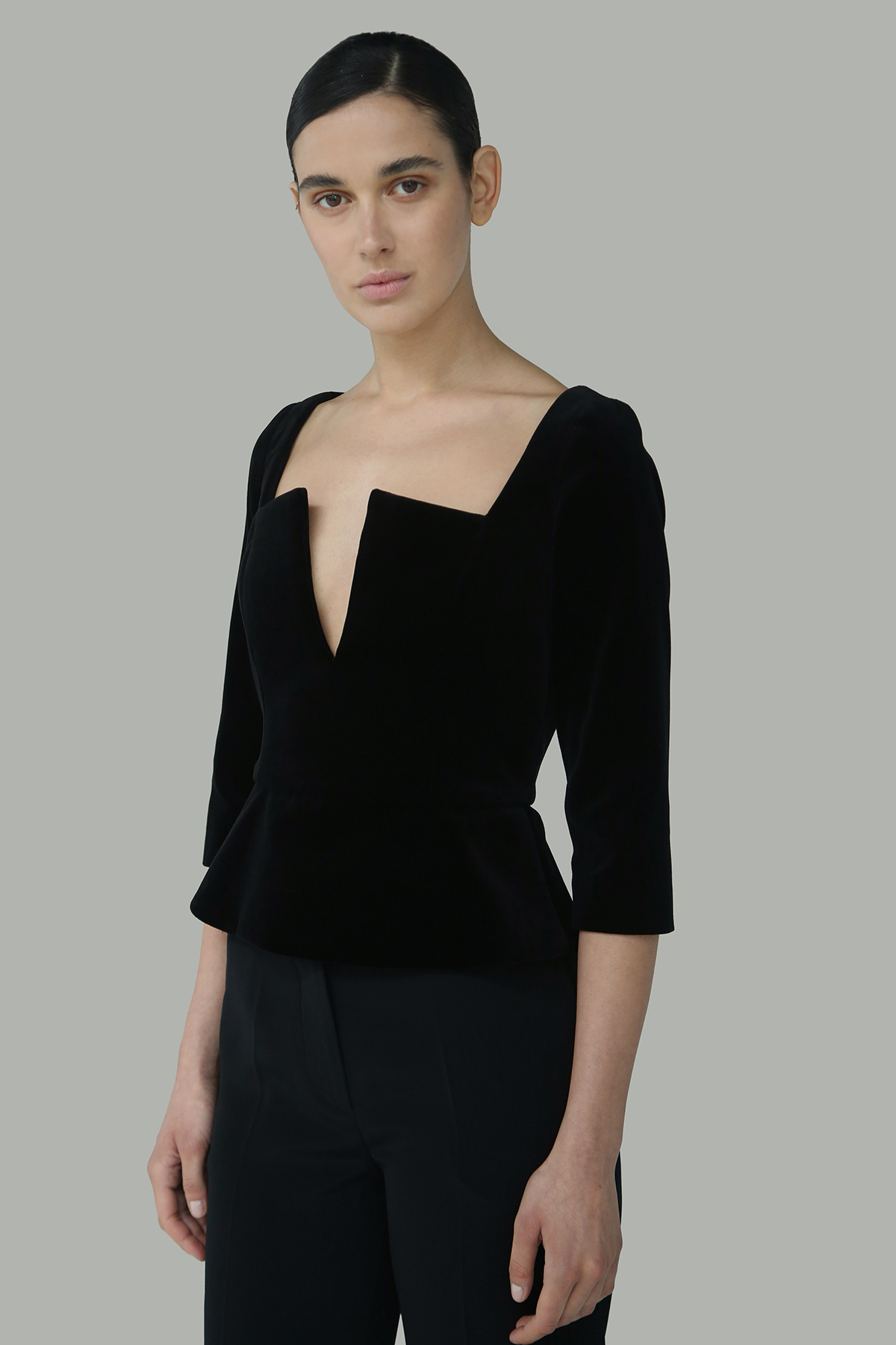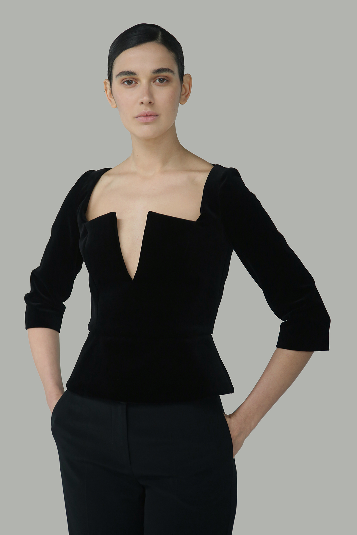 DescrizioneCorpetto con scollo geometrico realizzato in velluto di cotone caratterizzato da una linea estremamente femminile con maniche a tre quarti e zip apribile sul centro dietro.