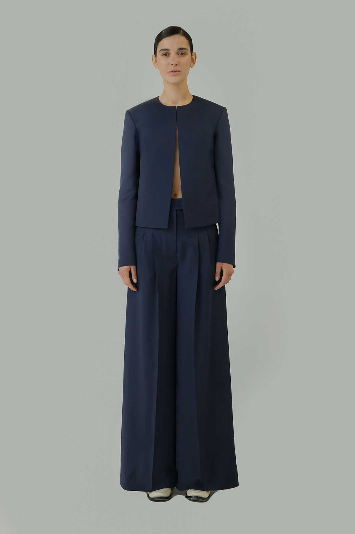 DescrizioneGiacca monopetto, girocollo a taglio corto realizzata in pura lana, dalla linea minimal e sofisticata con spacchi lungo la manica.