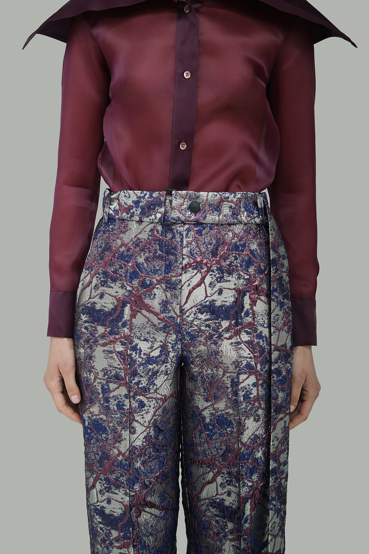 DescrizionePantaloni wide leg con piega stirata realizzati in elegante broccato con grande risvolto, tasche laterali, cintura con passanti ed elastico interno sul centro dietro per garantire maggiore vestibilità, tasche a filetto sul retro. Chiusura con listino alto in vita, patta con zip e gancetto.
