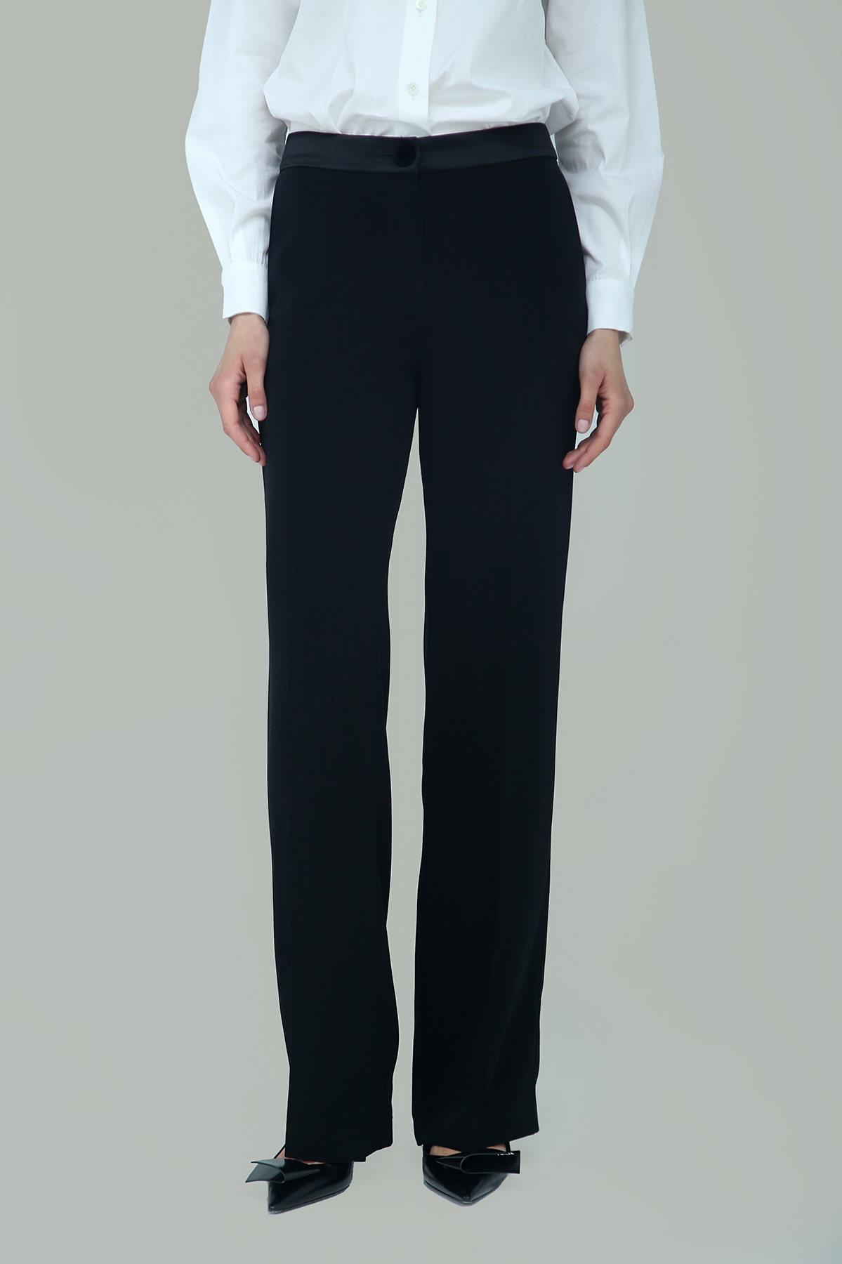 DescrizionePantaloni wide leg con piega stirata realizzati in elegante cady, tasche laterali, cintura in raso e tasche a filetto sul retro rivestite con dettagli di velluto. Chiusura con zip coperta e bottone centrale rivestito.